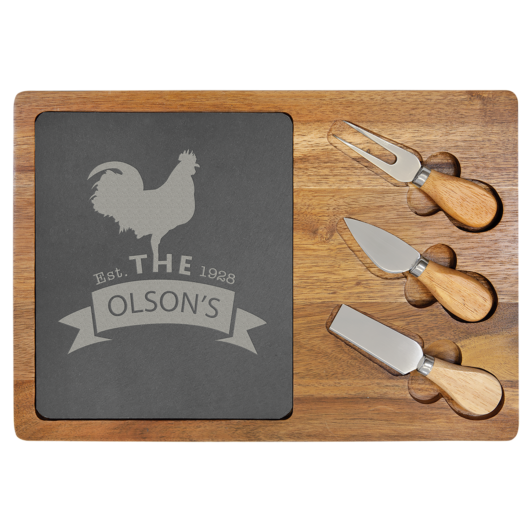 Personalized large 13 3/4" x 9 3/4" x 1/2" acacia wood and slate cheese board set featuring 3 serving tools. This engraved larger cheese board makes the ultimate token of appreciation for charcuterie fans. This attractive cheese set features a slate cutting board framed by acacia wood, along with 3 useful tools (a cheese serving fork and 2 knives) on the front. Both the wood and slate can be personalized with the design of choice. If you're looking for a great personalized gift for a wedding, housewarming, appreciation, or just about any occasion, this may be it!