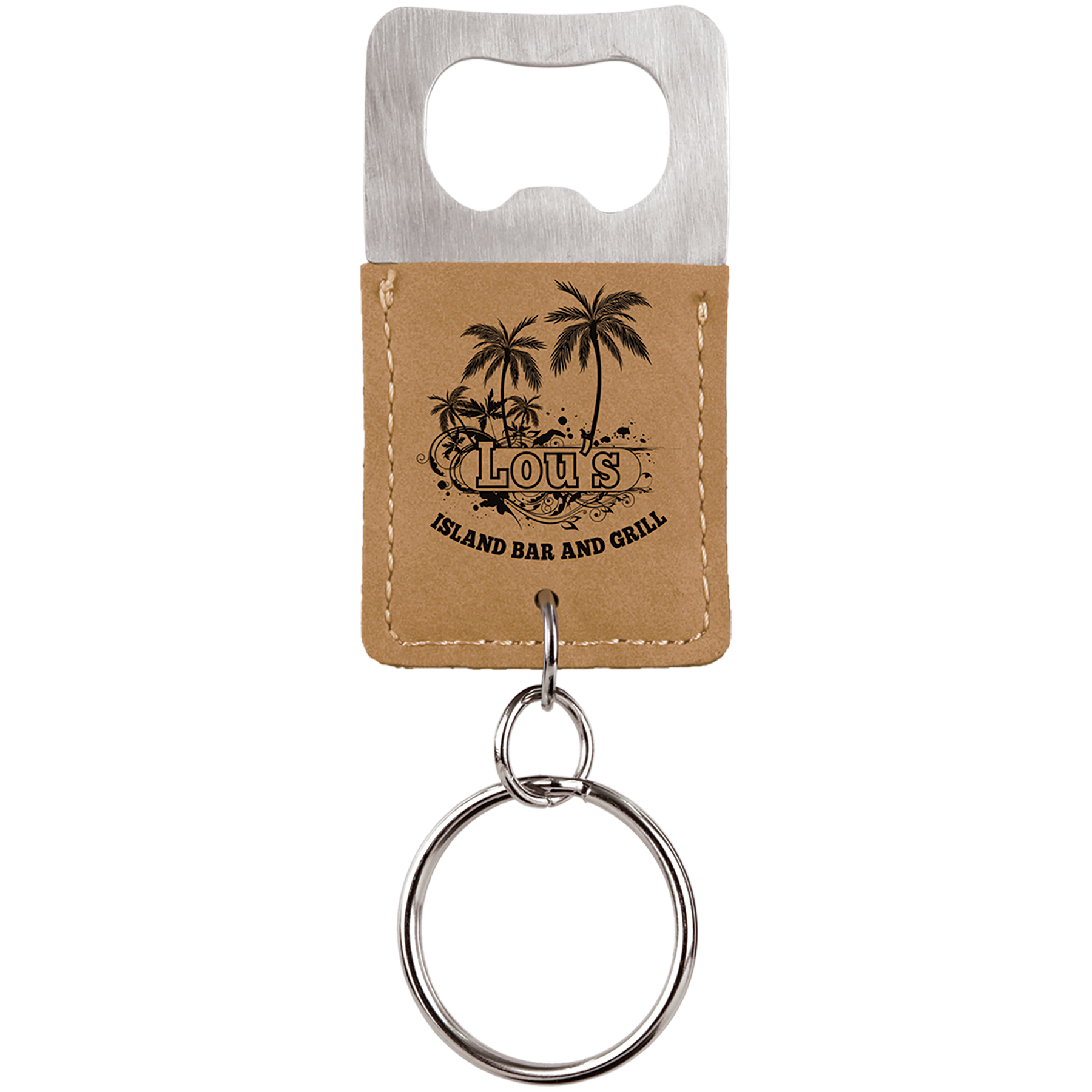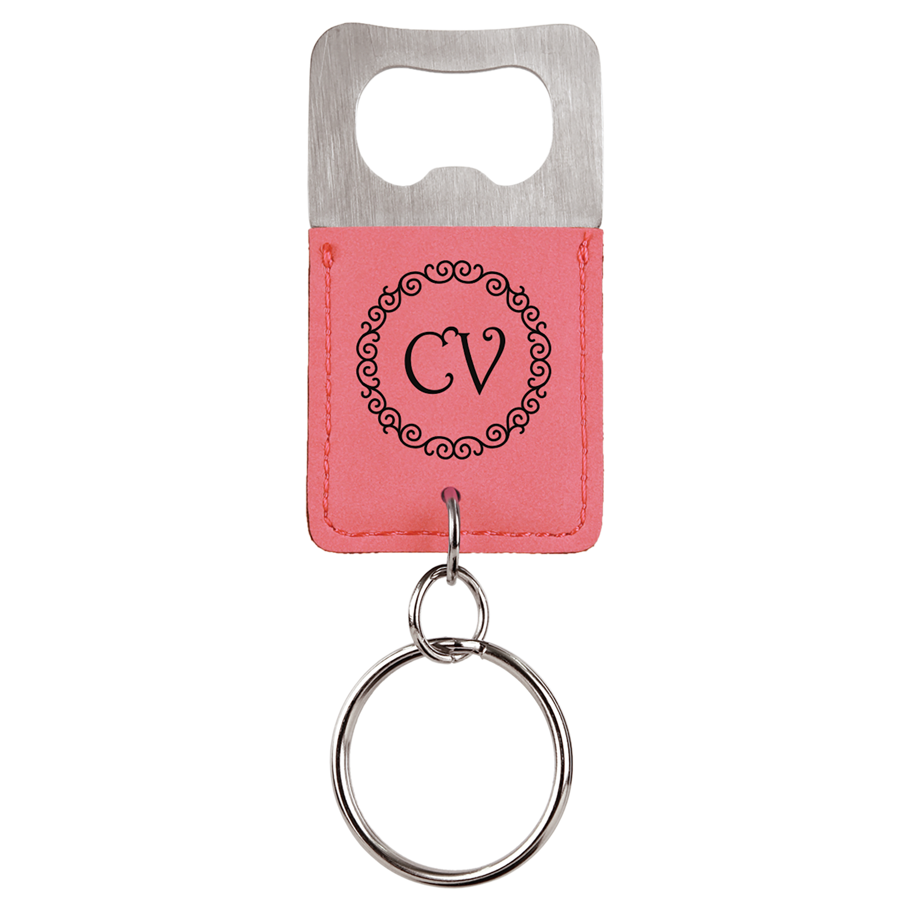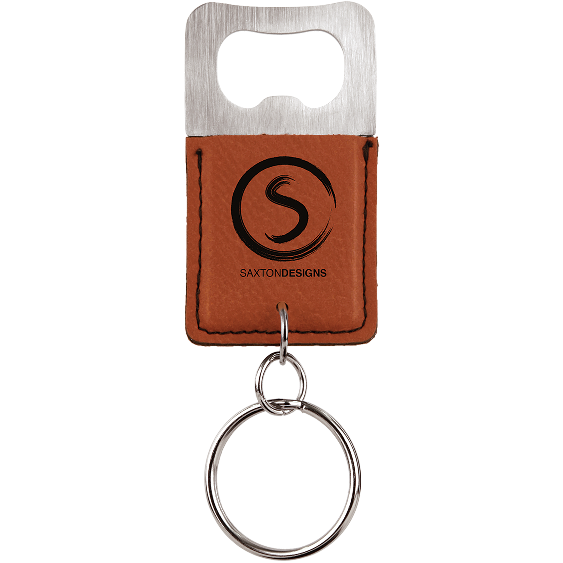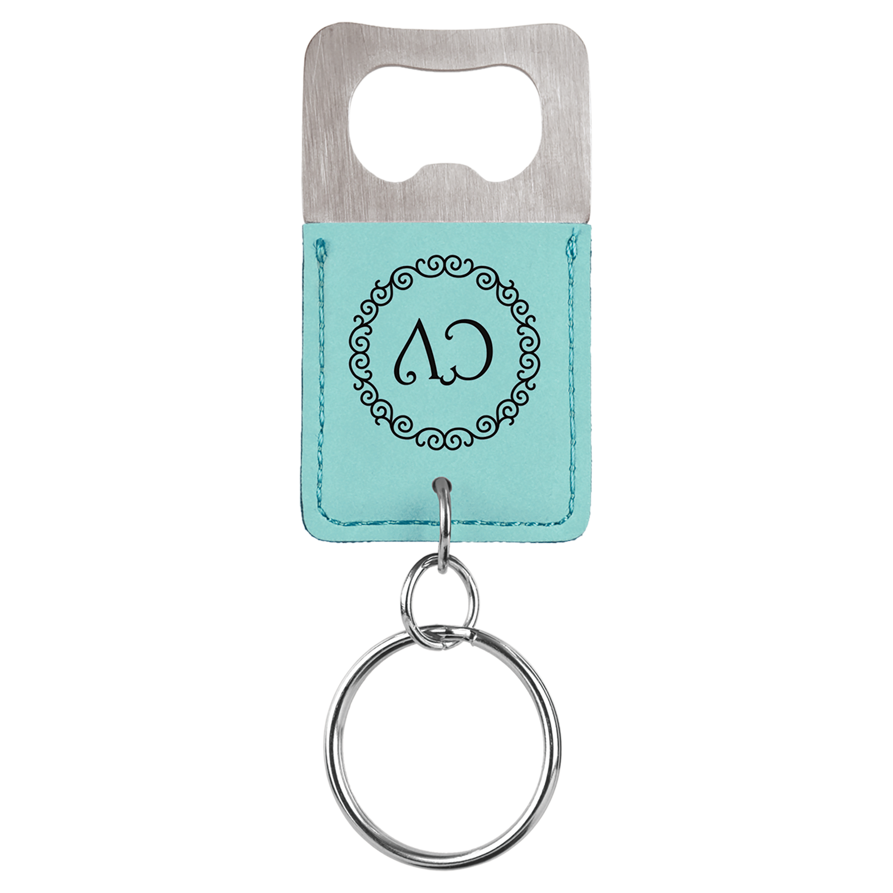 Personalized Leatherette square bottle opener keychain, a key ring essential. A practical gift and branding item when engraved with your logo. Compliments rectangle logos and artwork nicely. Leatherette offers the look and feel of genuine leather at a fraction of the price. This richly textured, synthetic material is water resistant, easy to clean and durable enough for the rigors of daily use. The high-quality workmanship of each leatherette piece is sure to impress every recipient with its elegant individuality. Available in multiple colors, these serve as an extremely handy gift or addition to a gift basket.